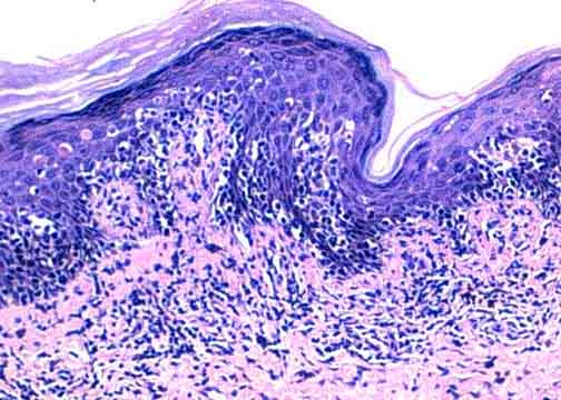 The neoplastic T-cells are spread out in a horizontal band just below the epidermal-dermal junction. Other malignant cells infiltrate the epidermis in a manner called "epidermotropic" that is characteristic for cutaneous T-cell lymphomas. Despite all the lymphoid cells infiltrating the epidermis, there is relatively little spongiosis compared to what might be present in a benign inflammatory lesion. |