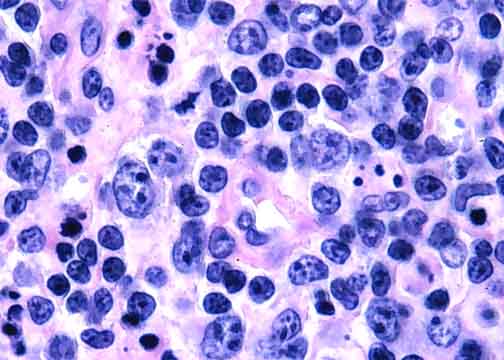 The malignant T-cells are heterogeneous in size and shape. Among the morphologic clues (not necessarily present here) that a lymphoma derives from T-cells are clear cytoplasm; a diverse benign inflammatory accompaniment including eosinophils, histiocytes, and others; and multiple small foci of necrosis. |