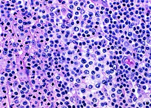Here the neoplastic large T-cells with clear cytoplasm are seen in the center. The small, bluish lymphocytes are at the right, and the reddish areas of necrosis and neutrophils are at the left. |