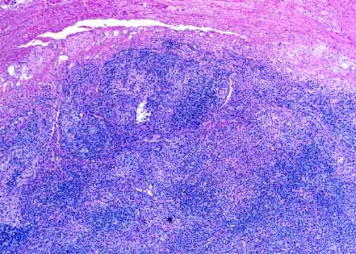 This is a large cell PTCL that partially replaced the lymph node. The case is unusual for the banded or mottled pattern seen here at low power. A thickened capsule is at the top. |