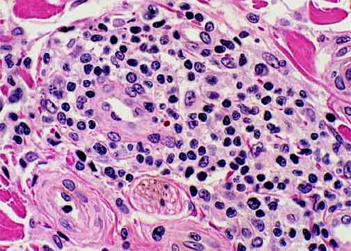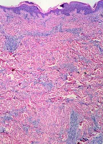 There are bluish clumps of malignant T-cells in the superficial and deeper dermis, mostly around vessels and adnexa. Unlike mycosis fungoides, the epidermis is not involved, so that the strip of papillary dermis immediately beneath the epidermis is uninvolved. This is called the "Grenz zone", from the German word for border. This is an example of a peripheral T-cell lymphoma involving only the skin at this stage of its career. Although the depth of the lesion and the occasional atypical cell (see below) are clues to its malignancy, one might hesitate to make a diagnosis of lymphoma were it not for molecular diagostic studies. These showed clonal rearrangements of the J-beta 1 and 2 genes. |