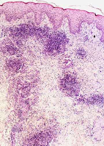 Clusters of malignant lymphoid cells surround dermal vessels and adnexal structures.