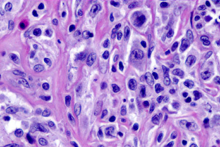 The lymphoma cells vary in size and shape. Many of them have ample cytoplasm, which in some cases appears clear. |