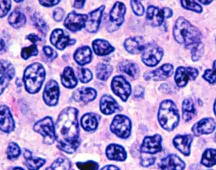 At high power the mixture of different size cells is apparent. Especially the smaller cells appear cleaved, with deep nuclear grooves and pointy nuclear out-pouchings. |