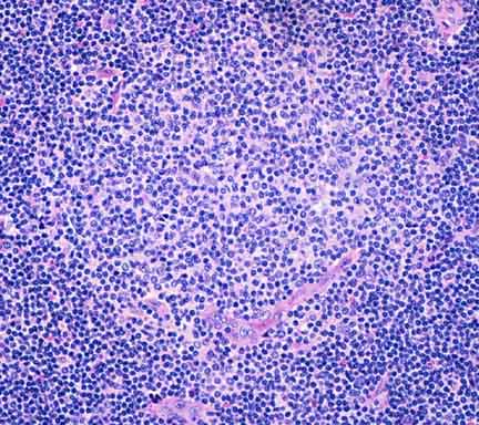 The neoplastic follicles are only moderately well-defined and are closely packed. |