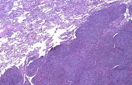 A neoplastic follicle at medium power. Even though these are relatively high grade neoplastic lymphoid cells, note that the mitotic rate (as well as you can perceive it at this power) is lower than what would be seen in the ferociously mitotic normal germinal center.