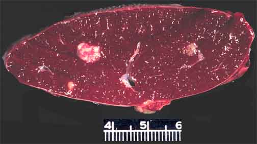 A spleen with 2 nodules of Hodgkin disease. Because splenic involvement may be minimal yet still alter the therapy, it is important to section the spleen as thinly as possible. These sections are usually fixed overnight and then sliced yet more thinly! This way nodules as small as several millimeters in diameter can be found.
