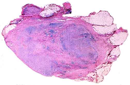 Thick fibrous bands divide this node into cellular nodules containing the neoplastic proliferation. The external fibrous capsule, normally thin and delicate, is also thickened.