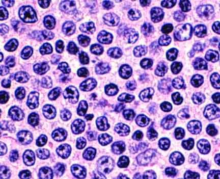 One panel shows the small lymphoid cells from a case of small lymphocytic lymphoma. The other shows benign small lymphocytes from a reactive lymph node. Which is which?