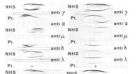Serum protein electrophoresis (SPEP). In the bottom plot, a sharp spike has replaced a diffuse hump in the gamma region, because normal gammaglobulins are decreased and large amounts of a single, monoclonal immuglobulin have taken their place. Because the protein is monoclonal, each molecule has identical electrophoretic qualities that move it to the same place in the electric field, creating a narrow, intense band or spike. Discovery of an M-component suggests the presence of multiple myeloma, monoclonal gammopathy of undetermined significance, Waldenstrom's macroglobulinemia, other lymphoproliferative disease, or primary systemic amyloidosis.