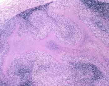 A serpentine granuloma from a child's cervical lymph node. Most suggestive of atypical mycobacterial infection. |